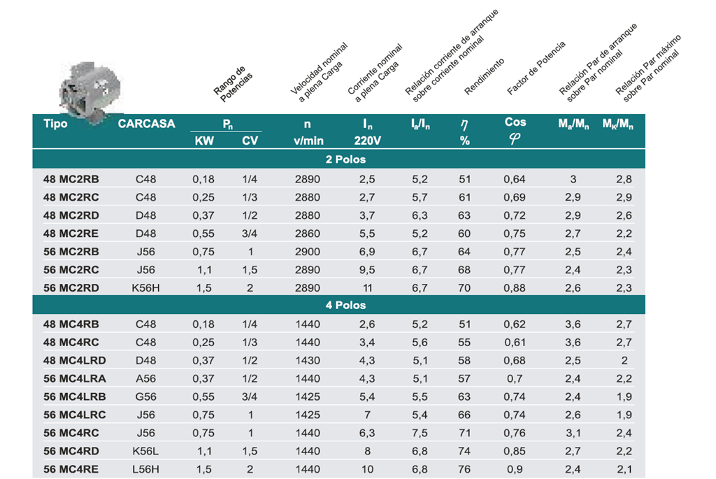 Motor Czerweny monofasico linea NEMA 50HZ IP21 clase B-S1/1500V.4 polos 220V 1KW/0,75CV